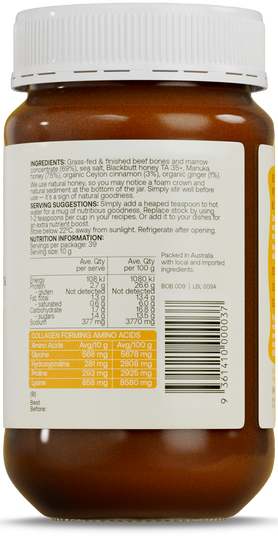 If you like honey and ginger (and natural energy), this Manuka Honey broth blends seamlessly into your morning! 100% grass-fed and finished Australia and NZ beef bones, sea salt, manuka honey, ginger and cinnamon. No fillers or additives.